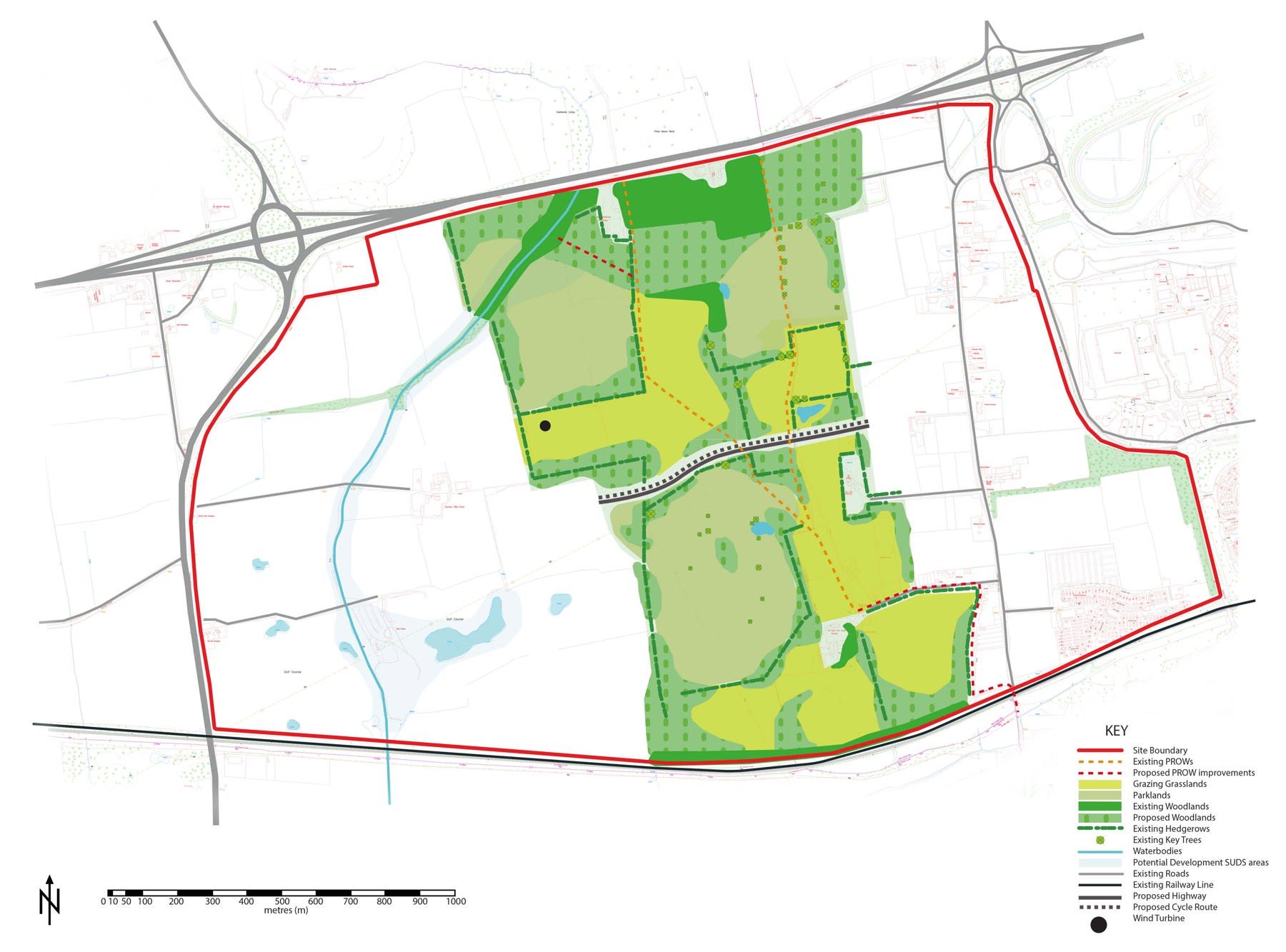 A detailed landscape analysis was carried out, looking at land use, landscape character, ecological importance, and the historic environment. This led to three schemes being produced, comprising of a combination of habitat types such as low-lying meadows, woodland, and grazing parklands. Different management strategies were also explored, along with ecological and design guidelines for future developers and highways.