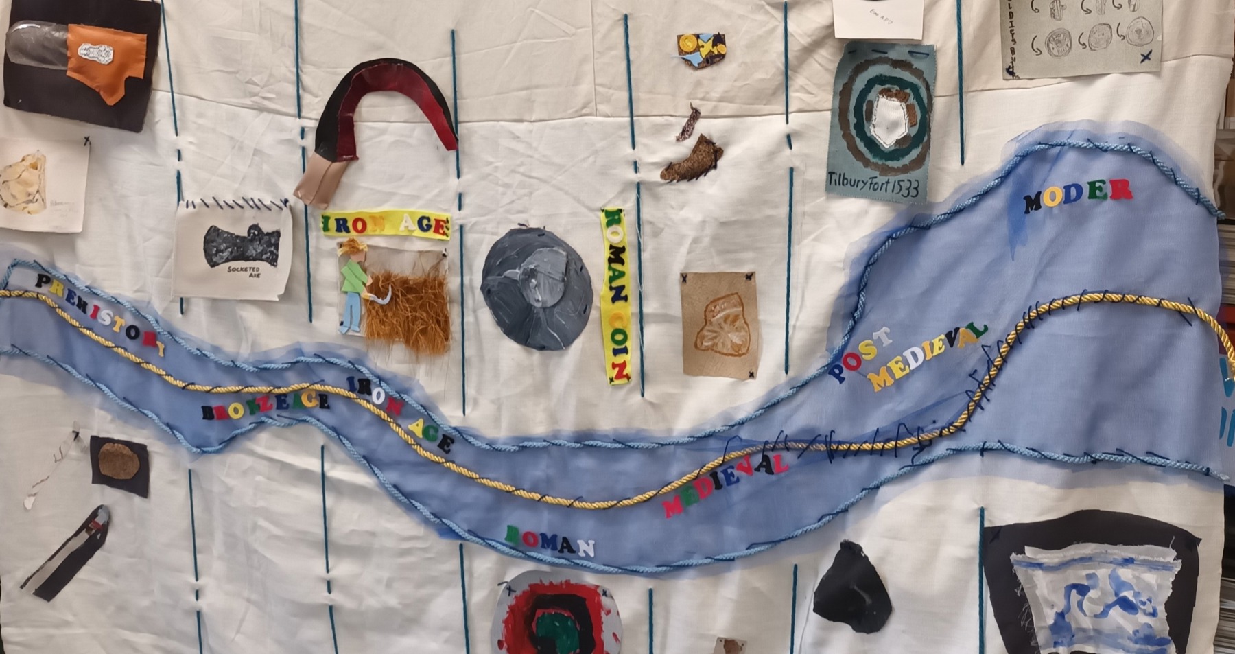 In addition, there was a range of activities for members of the public. Young people and carers at Thurrock Play Network created the amazing ‘Thames Through Time’ banner, which was inspired by their favourite artefacts. Other events included the exploration of prehistoric finds and mammoth making at Grays Library, and a number of walks and lectures highlighting the area’s heritage. These have covered topics such as the military history of the Thames, including visits to Coalhouse and Tilbury forts, riverine archaeology, and the heritage of the local Bata Shoe Company. Working alongside Thurrock Young Carers, the home school network, and Quarry Hill Academy, the project has created three exhibition pieces to be displayed in Thurrock.