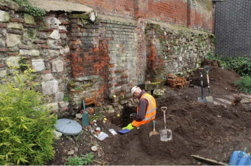 Place Services supplemented the recording by commissioning a programme of archaeological test-pitting, which allowed the foundations of the wall to be examined. This informed both the recording and the upcoming stabilisation works.
